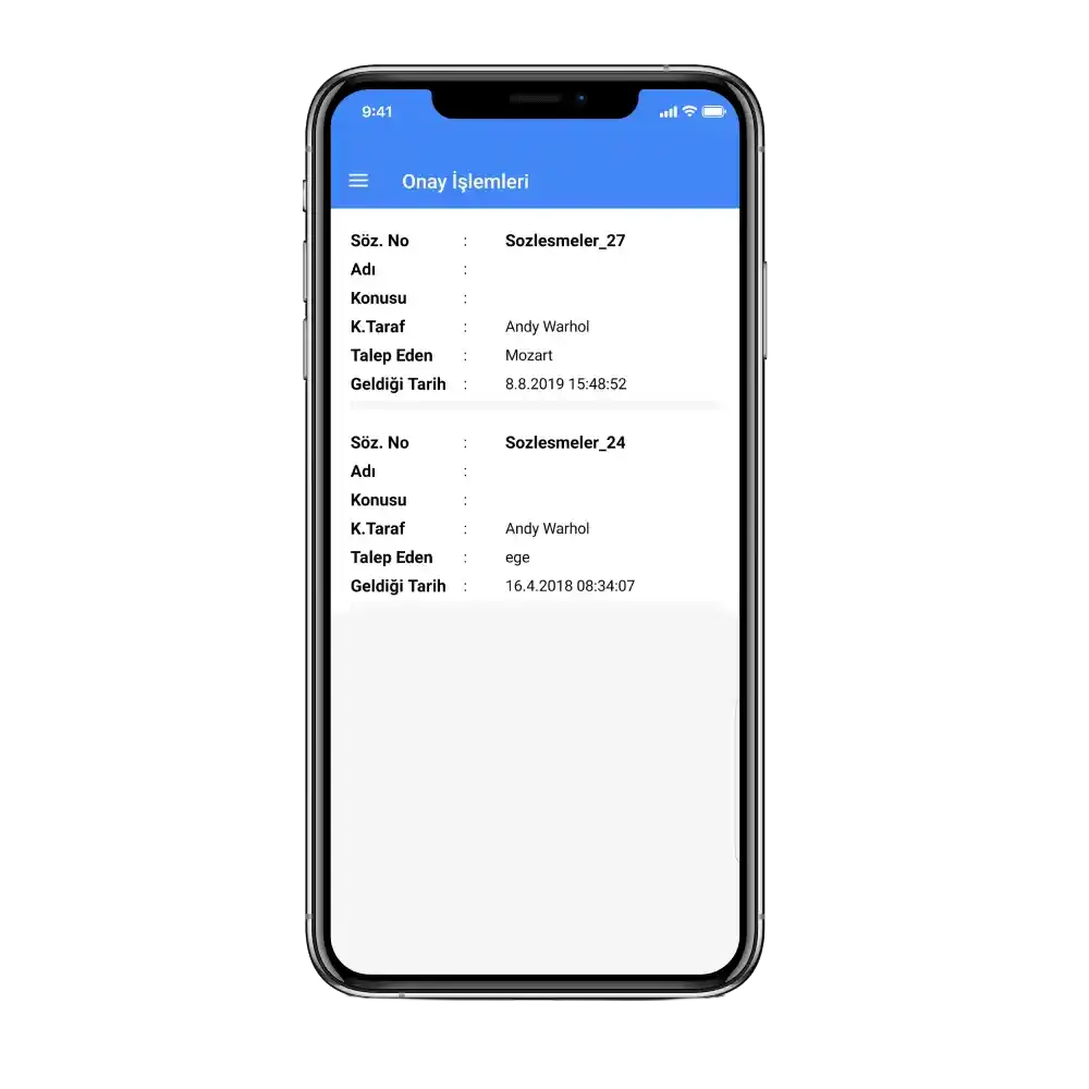 Yeni doküman ekleme veya eklenmiş olan dokümanların görüntülenmesini sağlayın. Hem dava veya icra dosyaları, hem de sözleşmeler ile ilgili doküman işlemlerini hızlıca tamamlayın. Benzer şekilde onayda bekleyen sözleşme veya davalara ilişkin dokümanları yine mobil uygulama ile görüntüleyin.